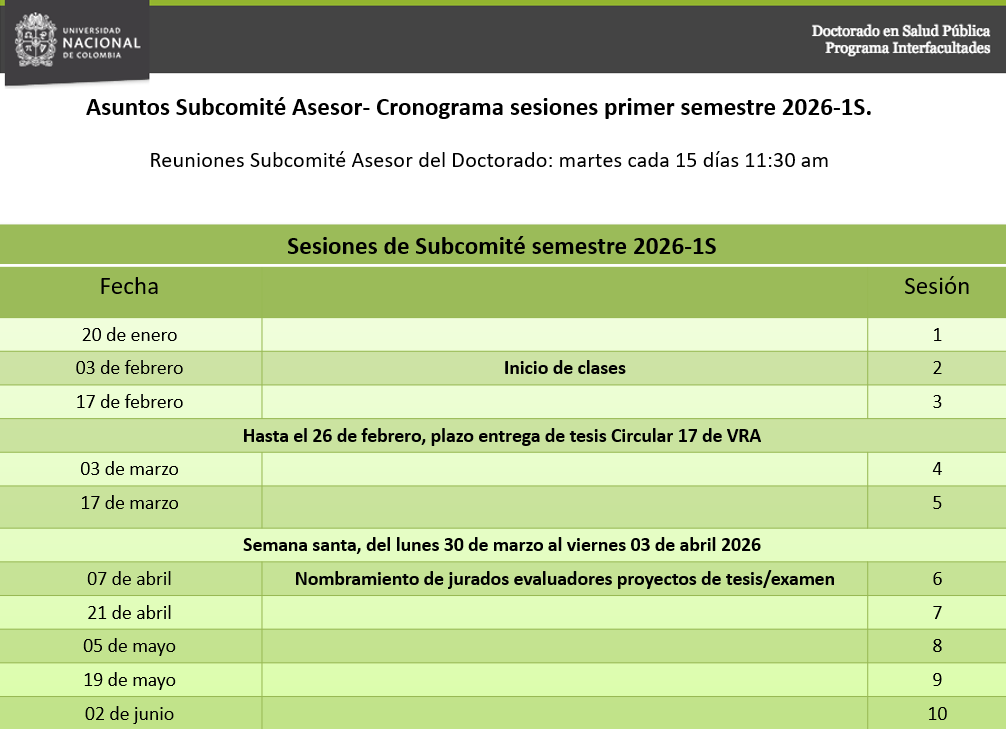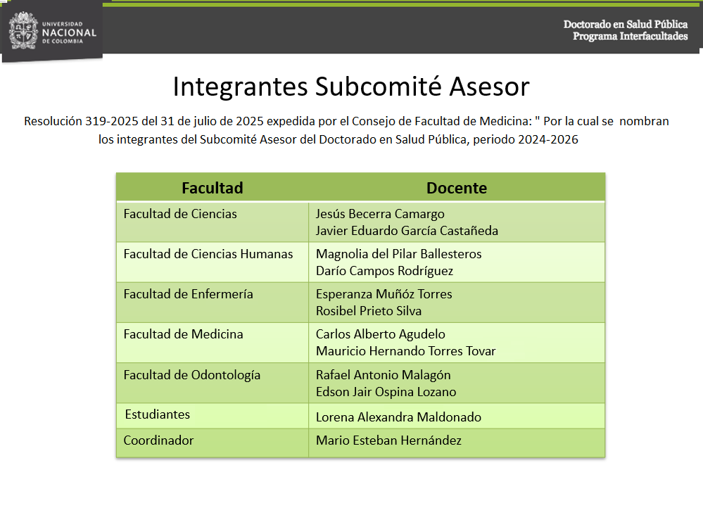 Subcomité Asesor Resolución 319-2025 del 31 de julio de 2025 expedida por el Consejo de Facultad de Medicina: ” Por la cual se nombran los integrantes del Subcomité Asesor del Doctorado en Salud Pública, periodo 2024-2026